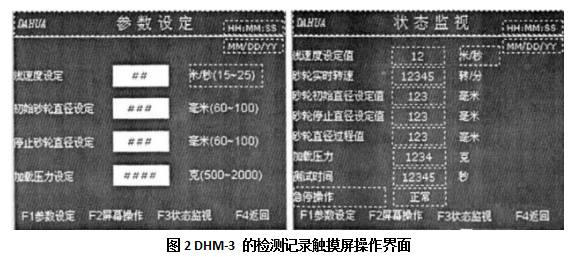 圖2是DHM-3的柱測記錄觸摸屏操作界面。通過該界面可以錕方便地蔣需要的工作參數(shù)錄^;通過狀態(tài)監(jiān)視界面可以實時地觀測、查詢檢測數(shù)據(jù)。