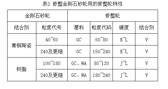 這種方法同時(shí)也可以用于修銳,是常用的一種修整方法。可用碳化硅、剛玉油石修整超硬砂輪,也可用動力驅(qū)動金剛石、碳化硅或剛玉砂輪來修整超硬砂輪。修整金剛石砂輪時(shí),修整輪的特性見表2。修整CBN砂輪的修整特性也可參考表2選取,只是其硬度應(yīng)取得略低一些。