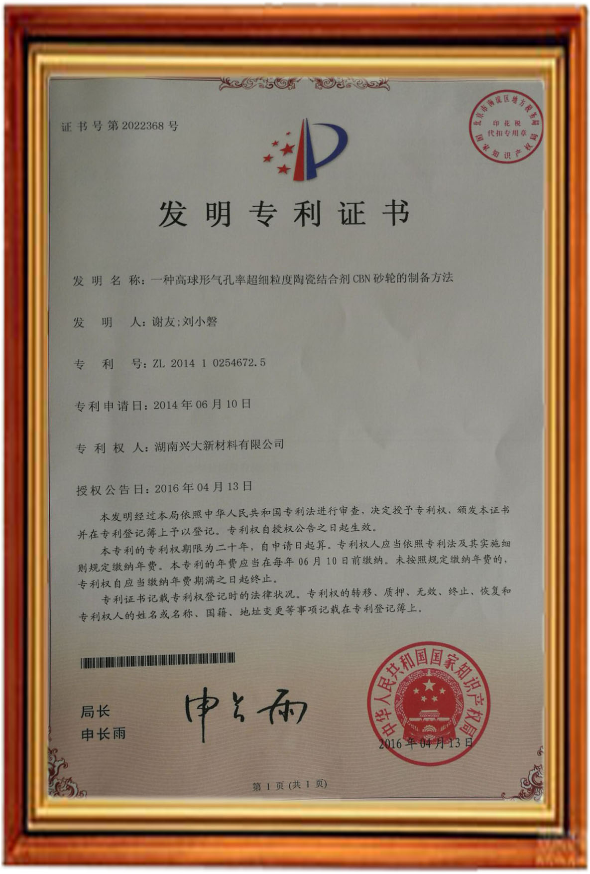 - 湖南興大新材料有限公司再次榮獲國家知識產(chǎn)權(quán)局頒發(fā)的一種高球形氣孔率超細(xì)粒度陶瓷結(jié)合劑CBN砂輪的制備方法發(fā)明專利,專利號為ZL 2014 1 0254672.5。 此項發(fā)明專利是研發(fā)人員經(jīng)過反...